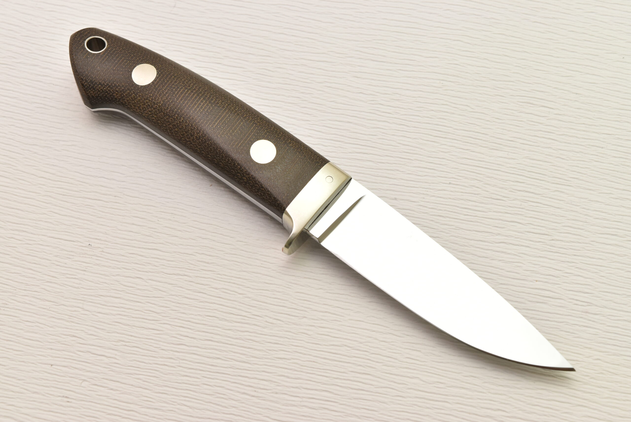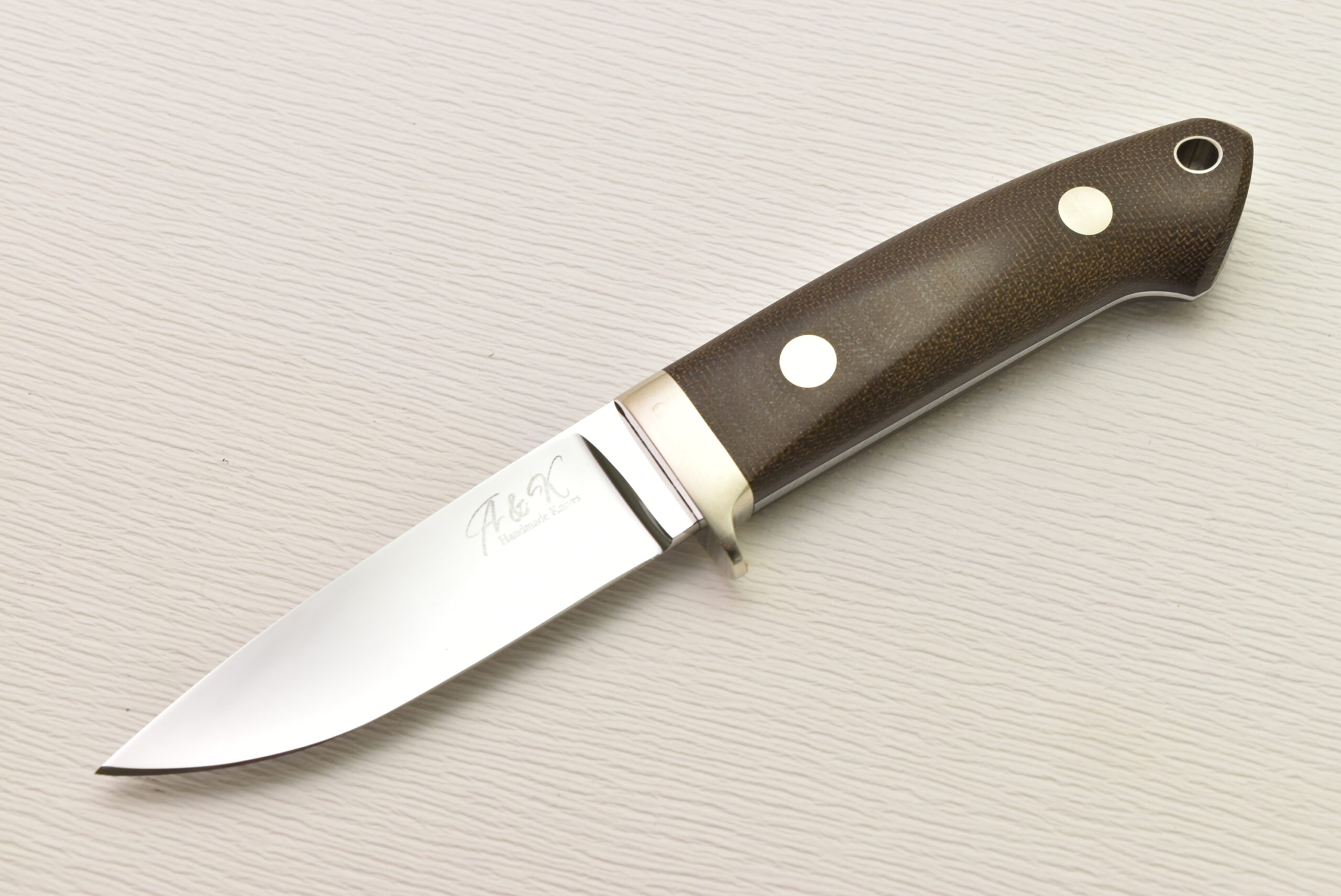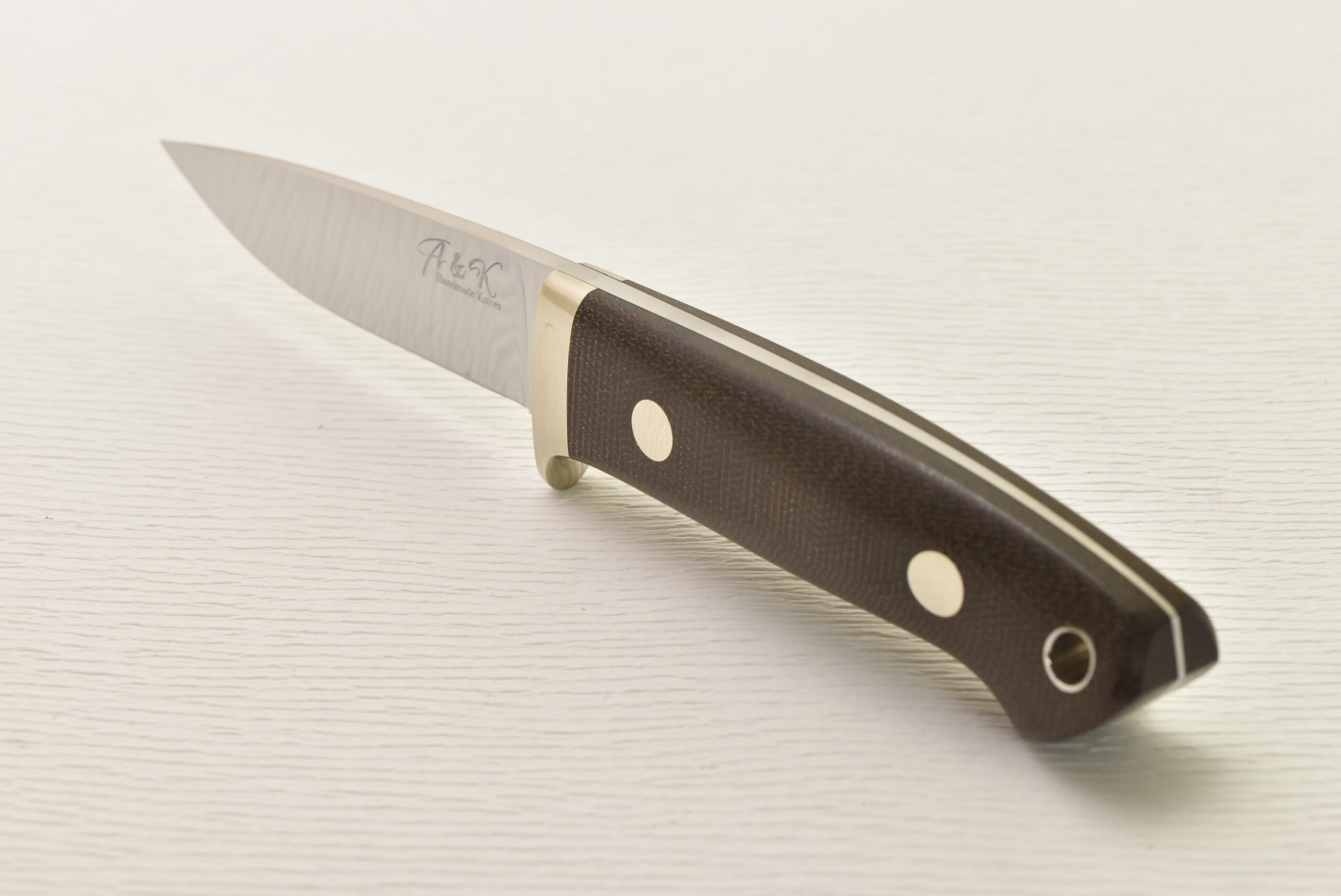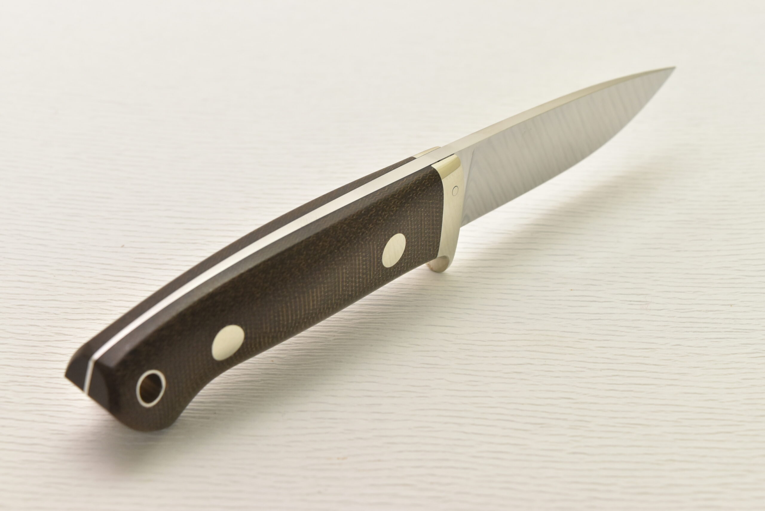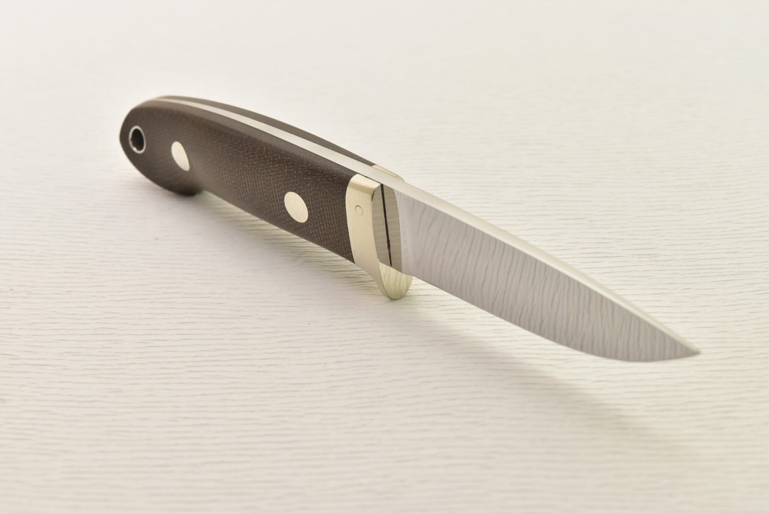 刃付けはこのナイフに関しては作者本人の手研ぎとなっており、箱出しでその切れ味を楽しむも良し、自分で研ぎあげるのもその楽しみの一つです。バックサイドのヒルトピンは少し見えますが、実用的な1本となっています。