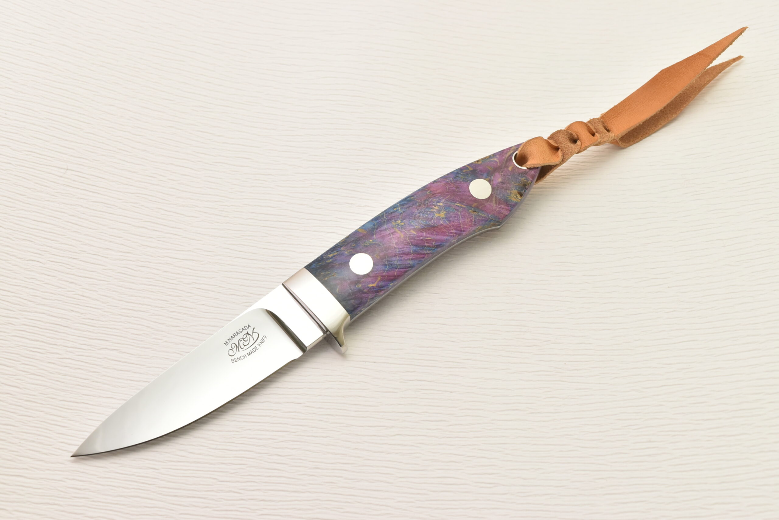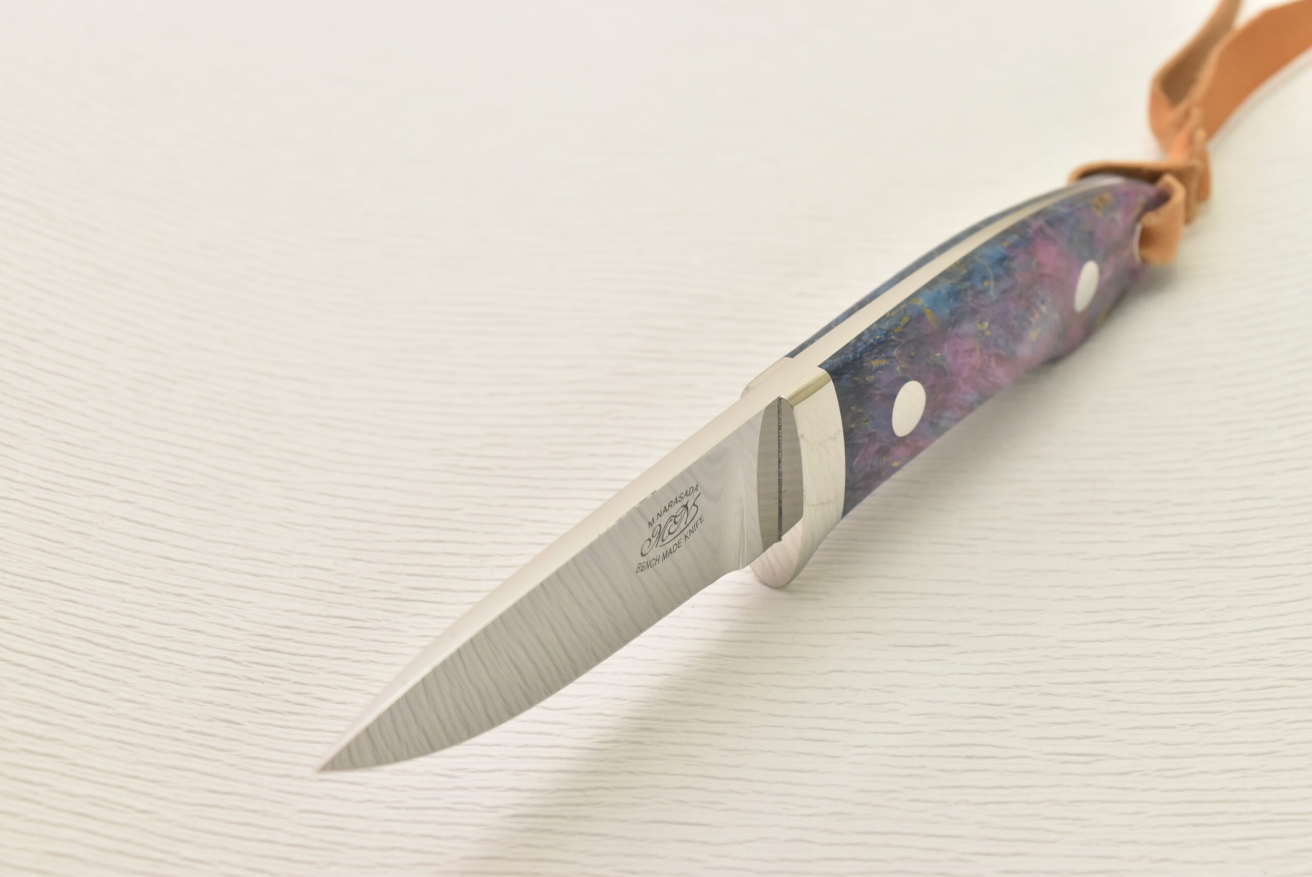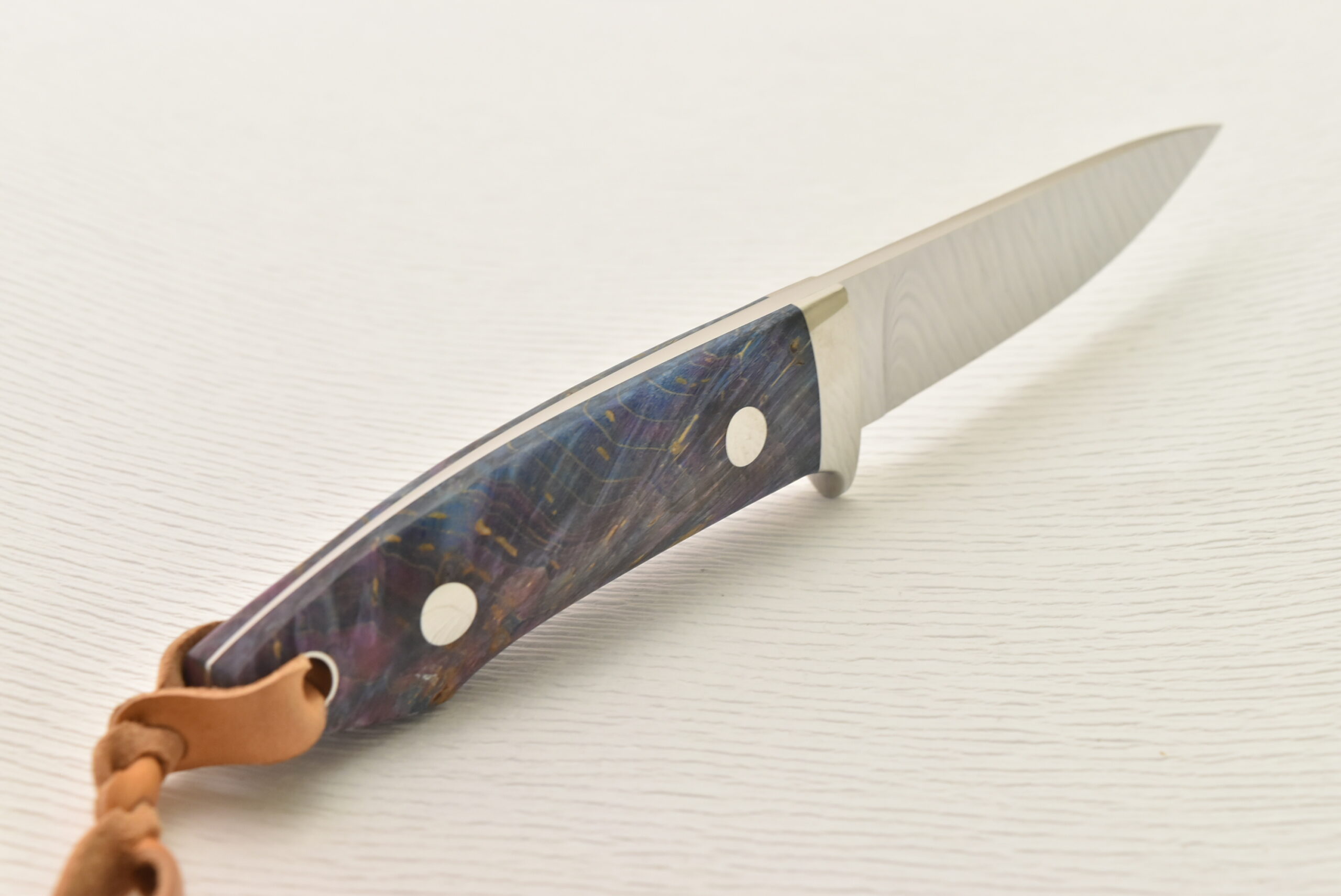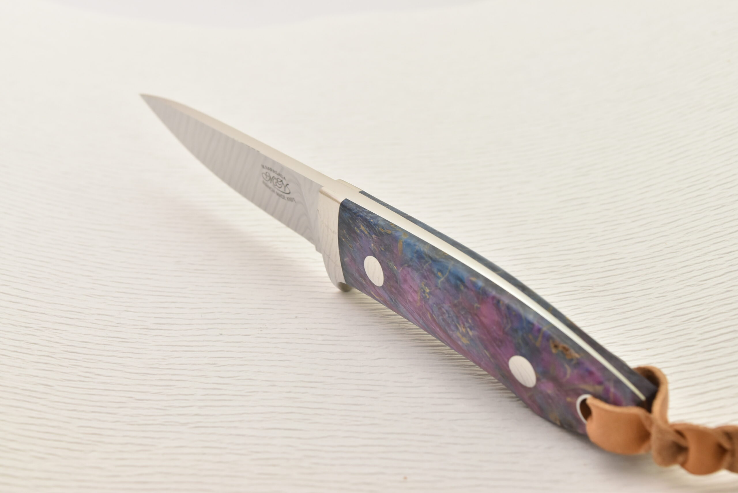ハンドルは薄く削られ、ハンドリング抜群の形状に仕上がっています。驚くほど軽く、気軽に使えるサイズ感、料理などで長い時間持っていても疲れにくくストレスがありません。そして、特筆すべきは、誰もが目を奪われる鮮やかなスタビライズドウッド。世界に一つだけの模様、色彩を、ぜひ楽しんでください。