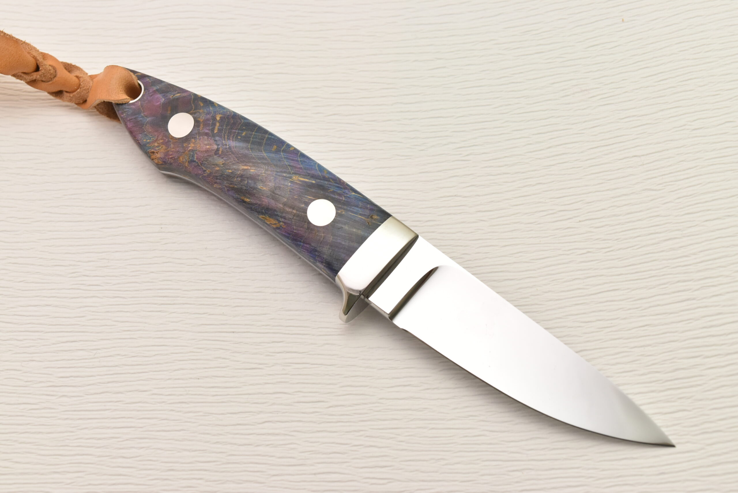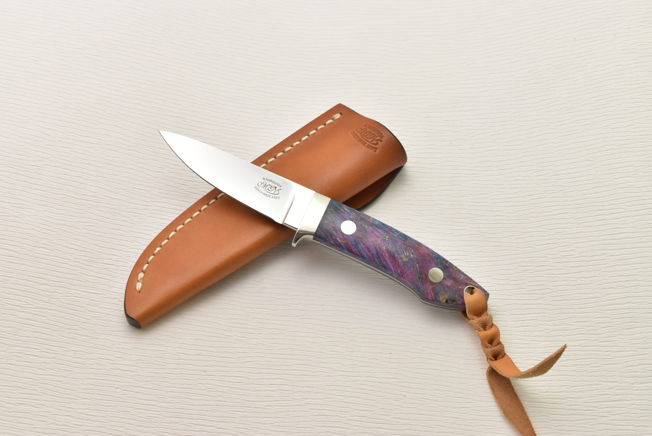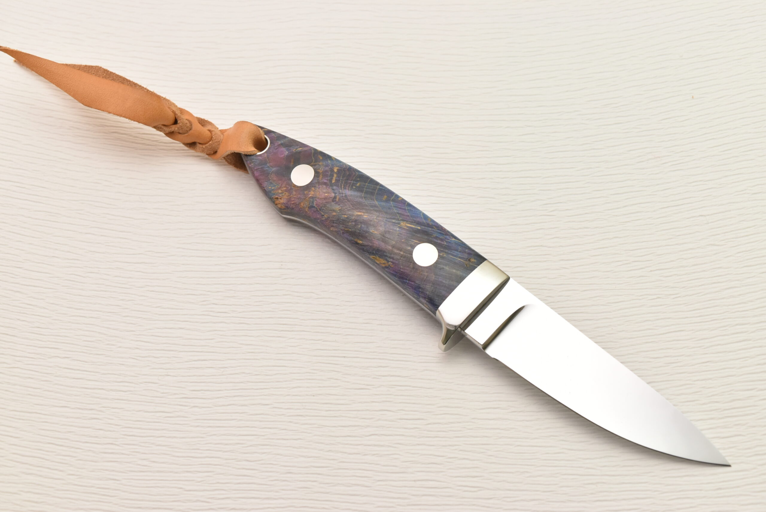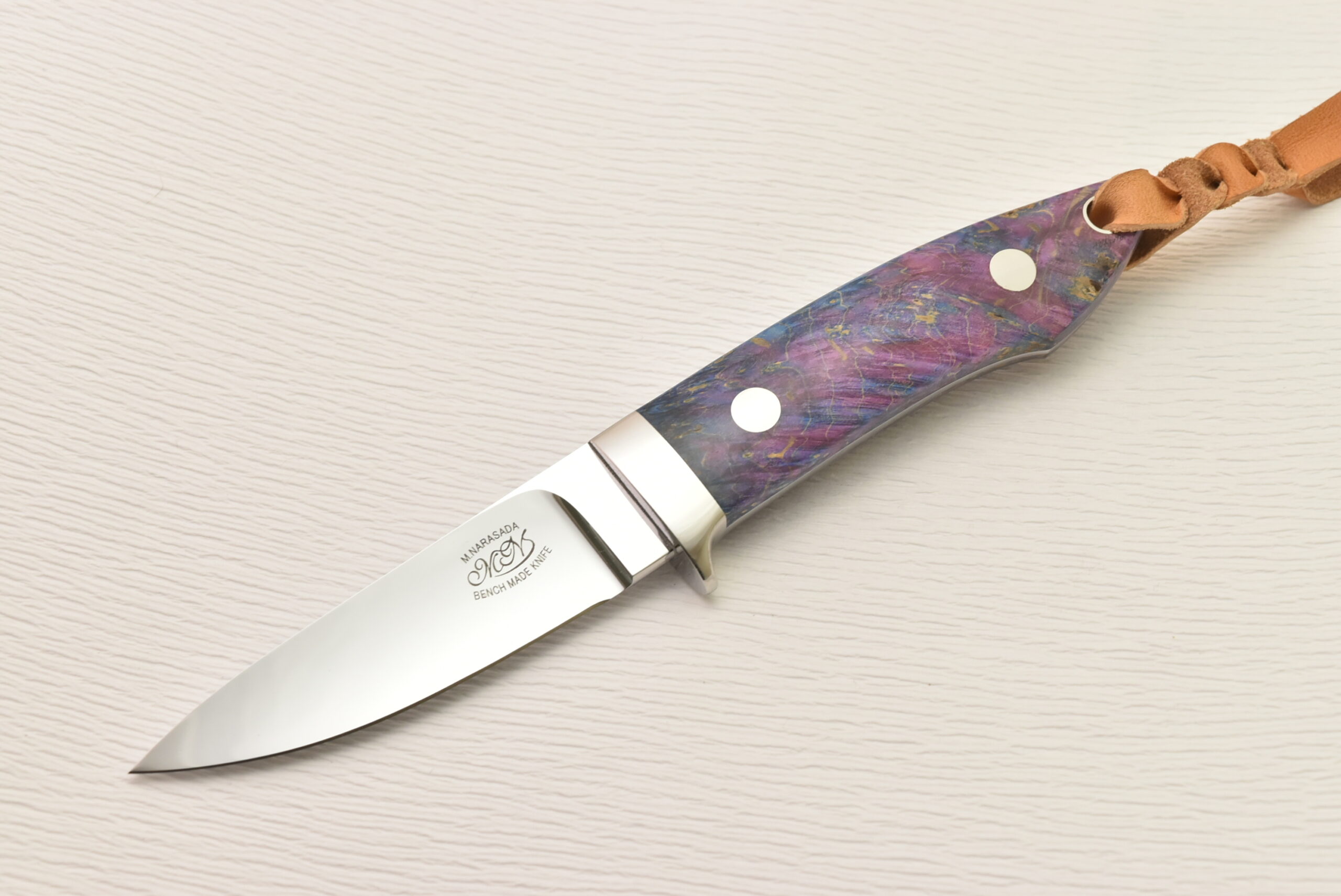 ハンドルは薄く削られ、ハンドリング抜群の形状に仕上がっています。驚くほど軽く、気軽に使えるサイズ感、料理などで長い時間持っていても疲れにくくストレスがありません。そして、特筆すべきは、誰もが目を奪われる鮮やかなスタビライズドウッド。世界に一つだけの模様、色彩を、ぜひ楽しんでください。